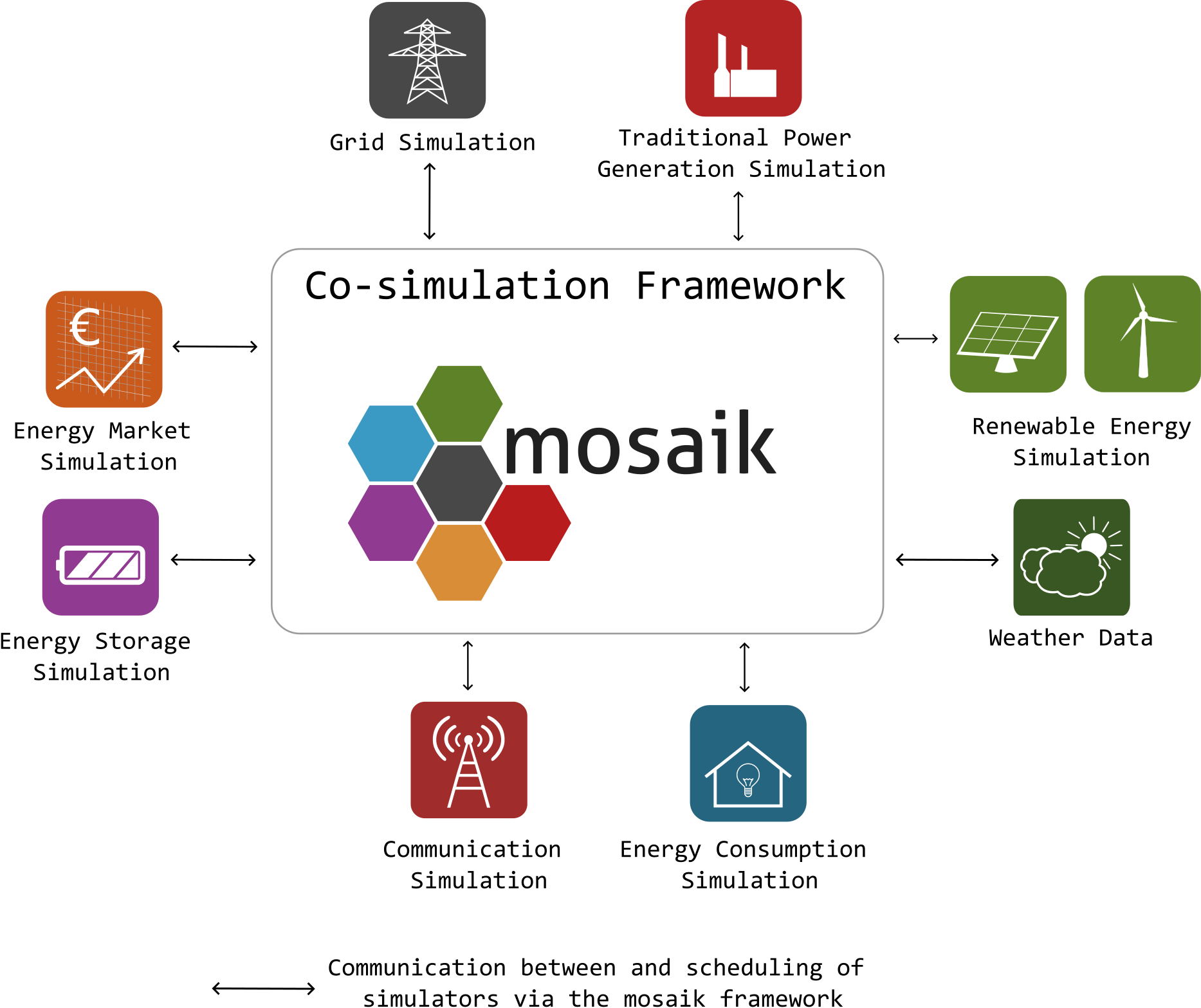 Bei der Simulation von Systemen können verschieden Ansätze genutzt werden. Eine Möglichkeit ist es, das gesamte System mit all seinen Teilkomponenten zusammen in einem Simulationstool abzubilden. Das hat jedoch den Nachteil, dass die Teilkomponenten schwieriger wiederzuverwenden sind und zusammen entwickelt werden müssen. Das übersteigt gerade bei komplexen Systemen mit sehr vielen unterschiedlichen Teilkomponenten häufig die Möglichkeiten eines Projekts. Außerdem ist ein einzelnes Tool häufig technologisch nicht die beste Wahl für die Modellierung aller Teilkomponenten. Daher ist der Ansatz bei der Co-Simulation, unterschiedliche Simulationsmodelle und Komponenten zu verknüpfen, um das gesamte System abzubilden. Im Bereich der Energiesystemsimulation sind dies zum Beispiel das Stromnetz, erneuerbare Energieerzeugung, Wetterdaten, eine Marktsimulation, Verbrauchssimulationen oder auch die Simulation der Kommunikation von IKT-Komponenten. Wie in der folgenden Abbildung dargestellt, sind diese Teilkomponenten über ein gemeinsames Framework verknüpft, welches die Orchestrierung übernimmt und die Kommunikation zwischen den Simulatoren ermöglicht. Diese Aufgabe kann zum Beispiel das Tool mosaik übernehmen.