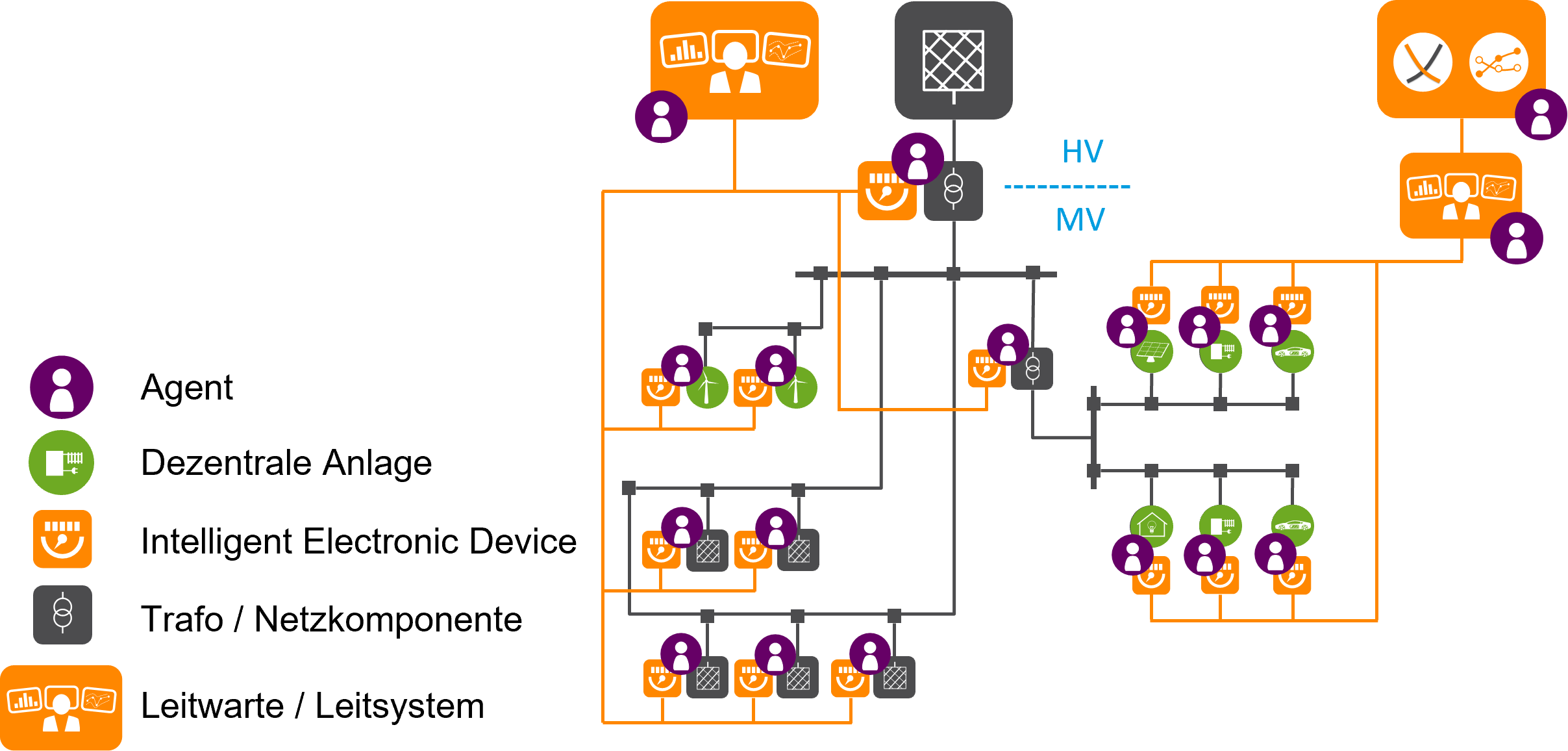 In Self-X-Systemen treffen intelligente Agenten autonom Entscheidungen, die nicht nur den Zustand des cyber-physischen Systems verändern, sondern auch Auswirkungen auf die menschlichen Nutzer:innen haben können. In unseren Arbeiten zu digitalisierten Energiesystemen überwacht und steuert ein einzelner Agent in der Regel eine individuelle dezentrale Energieanlage – etwa einen Batteriespeicher, eine Wärmepumpe oder die flexiblen Lasten eines Haushalts – oder ein einzelnes steuerbares Element des Energiesystems – etwa eine regelbare Ortsnetzstation oder einen Leistungsschalter im Verteilnetz. Übergeordnete Ziele, wie beispielsweise die maximale Nutzung lokaler Einspeisung aus erneuerbaren Energieanlagen oder die Einhaltung vorgegebener Spannungsgrenzen im Stromnetz, verfolgen die Agenten in kooperativer Weise als selbst-organisierender Schwarm. Dabei verhandeln die Agenten im Schwarm eigenständig untereinander, welchen konkreten Beitrag zum übergeordneten Ziel sie unter Berücksichtigung ihrer lokalen Ziele und Nutzerpräferenzen leisten können und möchten.