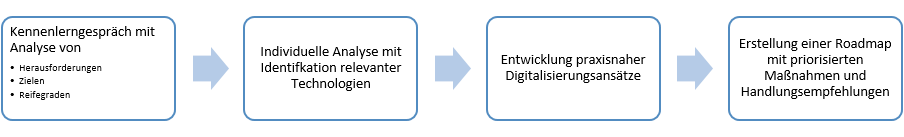 Wir beraten Unternehmen individuell bei der Identifikation, Bewertung und Planung von Digitalisierungsmaßnahmen. Gemeinsam analysieren wir bestehende Prozesse, erkennen Potenziale und entwickeln praxistaugliche Strategien, um Effizienz zu steigern, Innovation zu fördern und langfristige Wettbewerbsfähigkeit zu sichern. Unsere Beratung ist technologieoffen, bedarfsorientiert und fundiert durch aktuelle Forschungserkenntnisse.