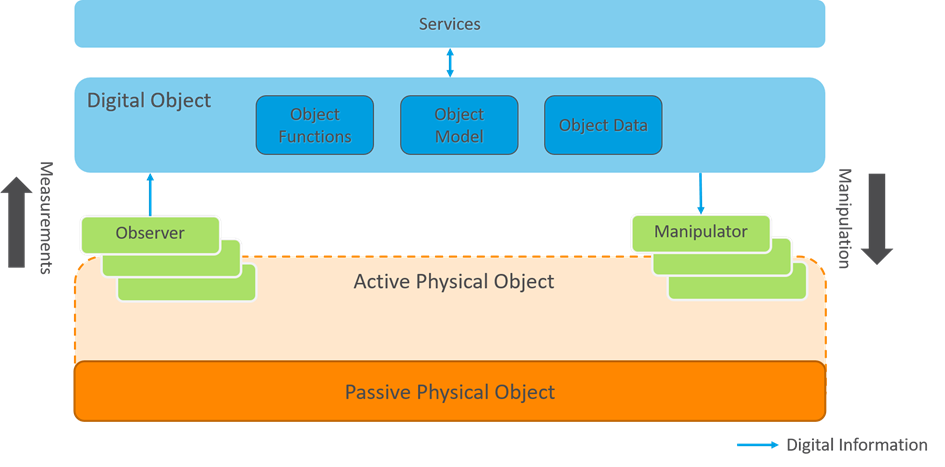 Ein großer Vorteil der Definition ist die Abbildung passiver physischer Objekte (Objekte mit unzureichender Sensorik) durch einen digitalen Zwilling. Eine schematische Darstellung eines aus der Definition entstandenen digitalen Zwilling ist in folgender Abbildung dargestellt.