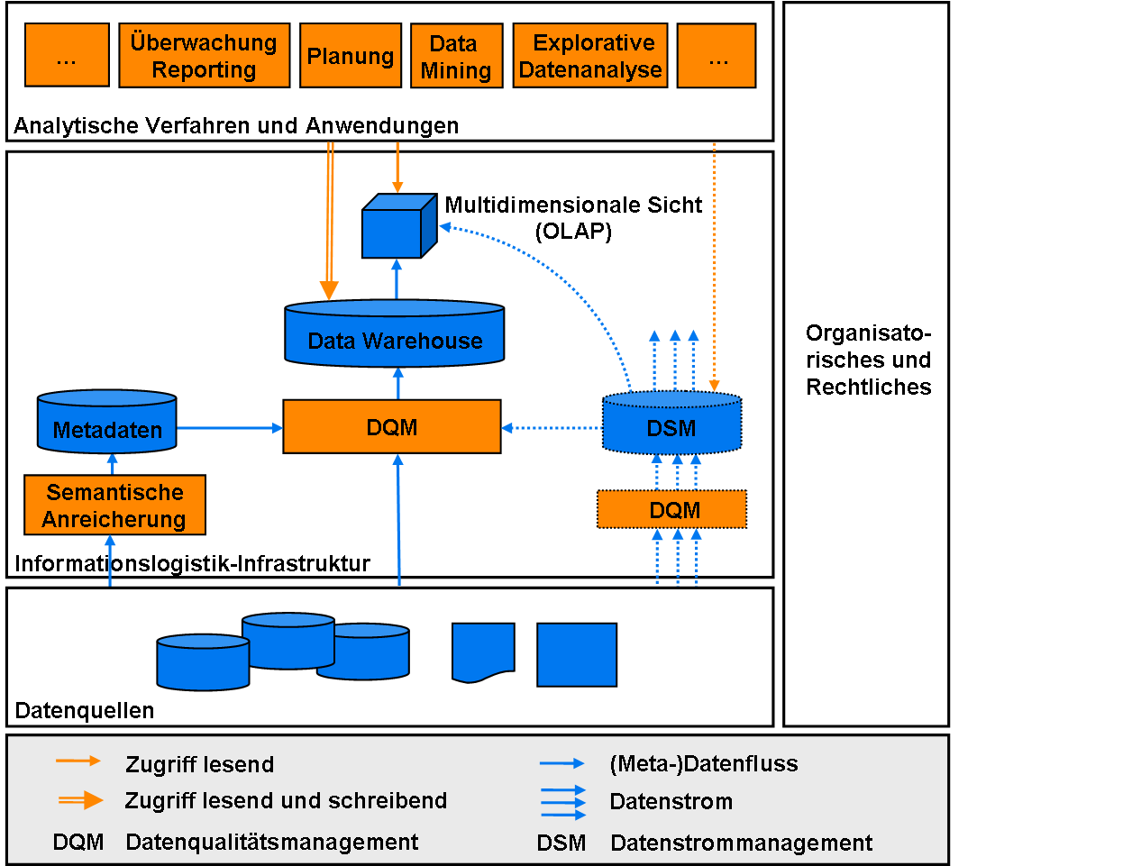 Die Einbeziehung von Daten aus heterogenen Datenquellen in ein Data Warehouse verlangt nach flexibel einsetzbaren Konzepten und Technologien für eine effiziente Datenintegration und das Datenqualitätsmanagement, z.B. hinsichtlich des Umgangs mit qualitativen Unzulänglichkeiten der Daten wie Inkonsistenzen, Redundanz und Unvollständigkeit. Neben Data Warehouse Technologien als Basis für die Informationslogistik-Infrastruktur werden auch Technologien des Semantic Retrieval für Gewinnung strukturierter Informationen aus Bildern, Webseiten und anderen Quellen einbezogen. Im Umgang mit Basistechnologien zum Aufbau bedarfsgerechter Infrastrukturen im Gesundheitssektor besitzt die Gruppe G-DMA eine langjährige Erfahrung. In Zusammenarbeit mit der Abteilung Informationssysteme der Universität Oldenburg wird erforscht, wie Technologien des Datenstrommanagements adäquat eingesetzt werden können, um solche Daten auszuwerten, die in zunehmenden Umfang durch Sensoren – z.B. im Kontext des Ambient Assistent Living (AAL) – anfallen. Durch die hohen Datenraten und die nicht persistent zur Verfügung stehenden Datenstrominhalte ist die Anwendung klassischer Technologien aus dem Bereich der DBMS und DWH in vielen Fällen unmöglich. Speziell das DQM bei Datenströmen bzw. das Modellieren von DQM-Anforderungen für ein proaktives DQM erfordern neue Konzepte.