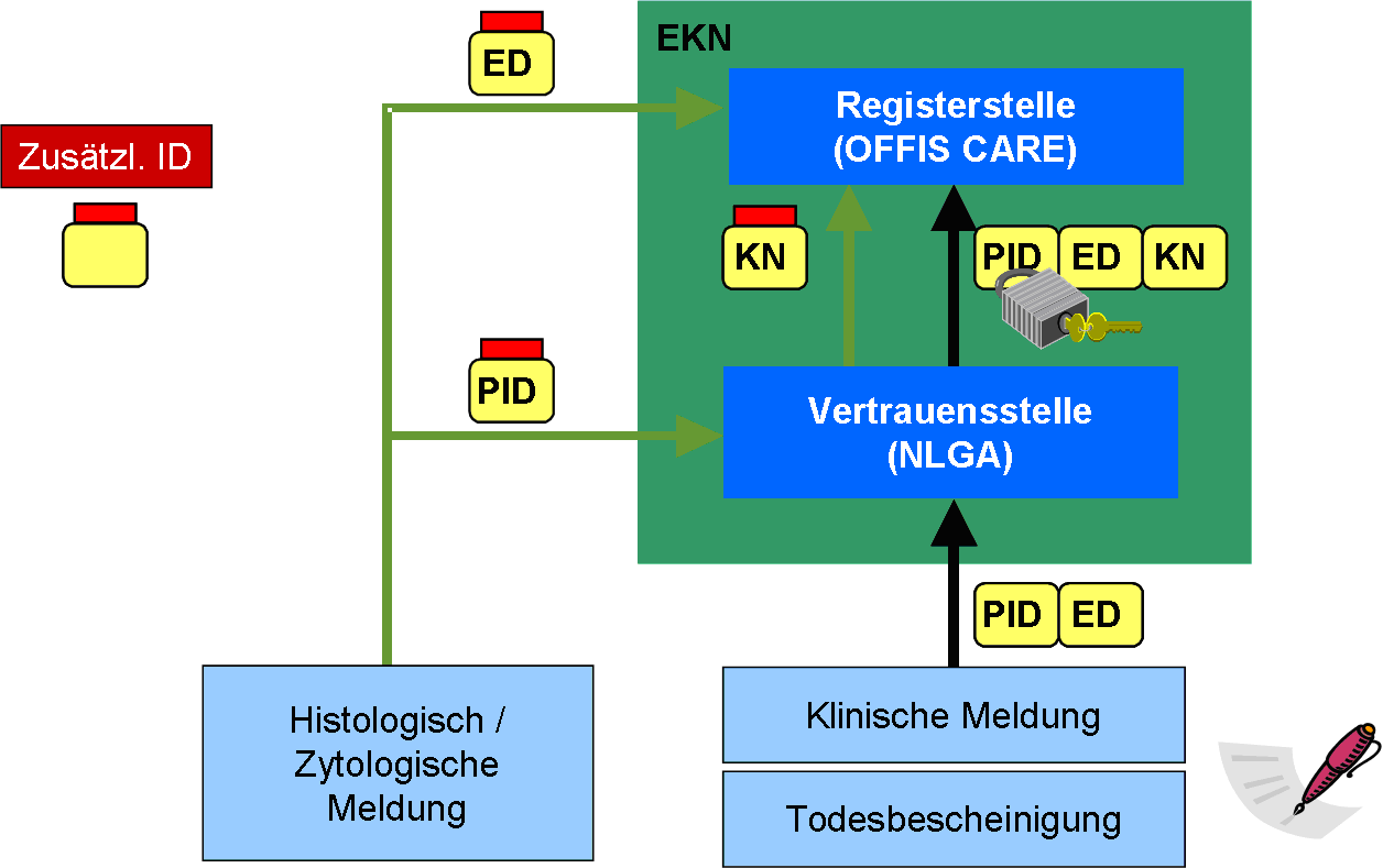 The use of sensitive data in the health sector requires new data protection, data security, role and data ownership concepts in the collection, processing and, in particular, evaluation of this data. In cooperation with epidemiological cancer registers, for example, concepts have been developed for the data protection-compliant cancer registration, which are based on two institutionally separate bodies, the trust authority and the registry. The trust centre collects patient-related cancer reports, encrypts the personal identifying data (such as name, address,...) and then transmits this encrypted information - together with the epidemiological data remaining in plain text - to the register centre. The Registry shall permanently store the encrypted personal identifying and epidemiological reporting data. If several, often significantly different reports refer to the same cancer case, they are combined using control numbers and condensed into an epidemiologically evaluable data set.