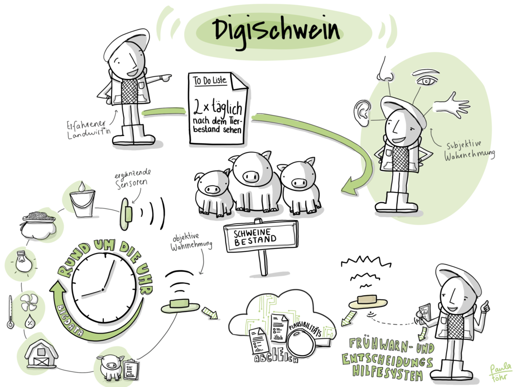 In order to support farmers in their daily work, an early warning and decision support system is being developed in "DigiSchwein": The focus of this work is on solving current practical problems in the keeping of pigs. These use cases include the keeping of undocked pigs and the associated prevention of tail biting, early disease detection in order to be able to isolate affected animals as early as possible, birth management in order to prevent the crushing of newborn piglets and to minimise the fixation times of the mother sow, as well as the monitoring of nutrient flows in the pig house.