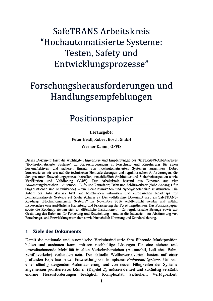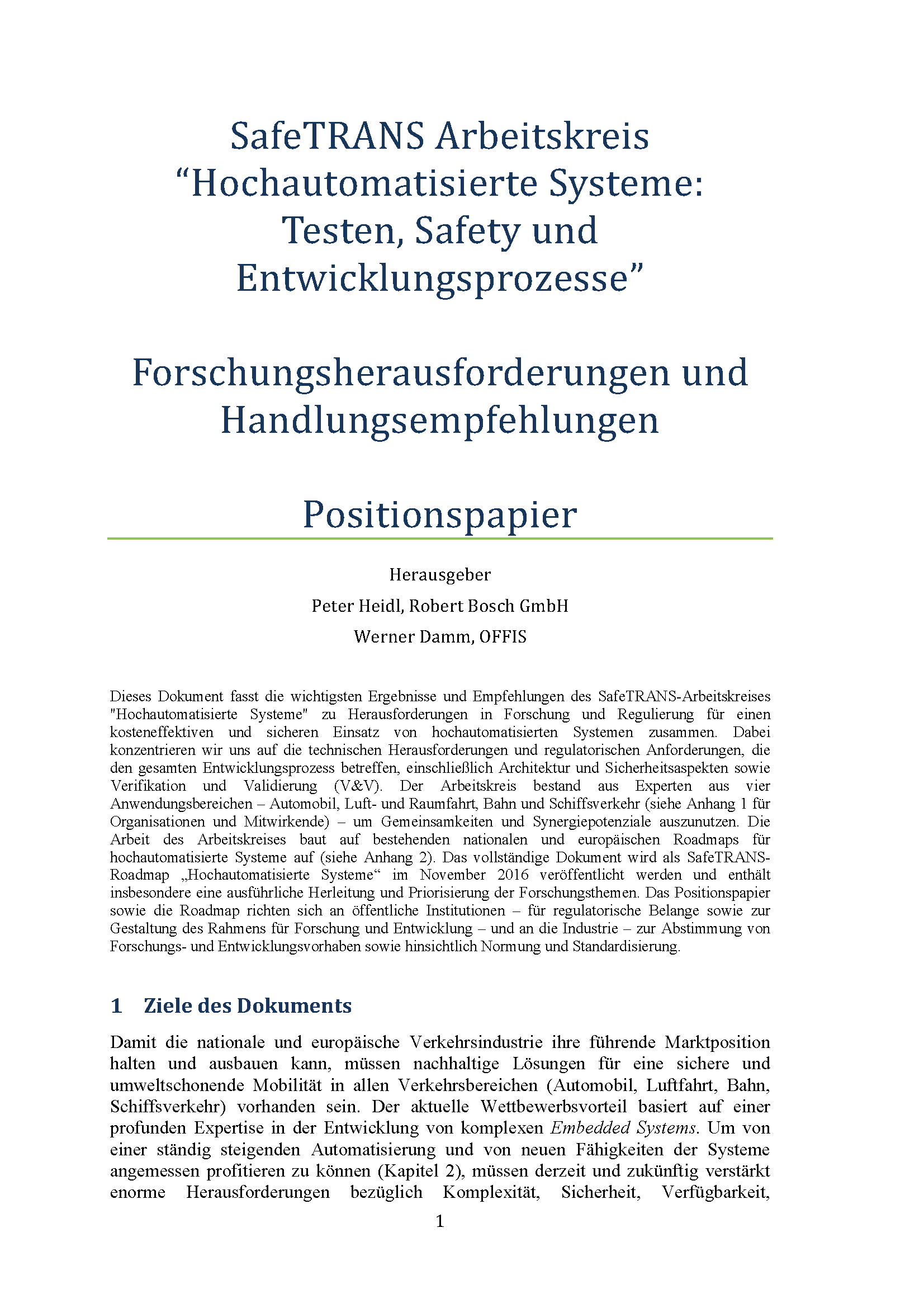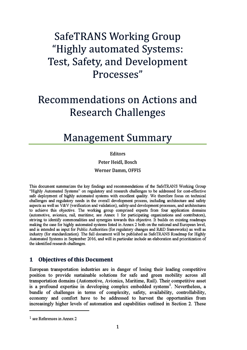 The Management Summary as well as the Roadmap were prepared by the SafeTRANS Working Group of Highly automated Systems: Safety, Testing, and Development Processes.