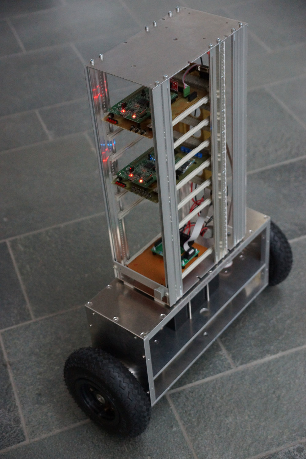 Der von OFFIS gezeigte autonome Serviceroboter "RackBot" bietet hier anschaulich eine Lösung. Er beruht auf dem Prinzip des in der Regelungstechnik beheimateten lagestabilen inversen Pendels, wie es auch ein Segway verwendet. Dadurch ist er ausgesprochen wendig, wovon die Besucher sich mit Spaß persönlich überzeugen können. Ein kleines Spiel fordert dazu auf, den RackBot durch den vorgegebenen Parcour zu manövrieren. Die Bestzeit des Tages wird mit einem kleinen Preis honoriert.