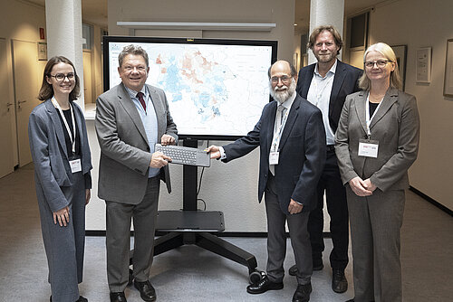 Niedersachsens Gesundheitsminister Dr. Andreas Philippi bei der symbolischen Veröffentlichung des neuen Niedersächsischen Krebsatlasses. (v. l. n. r.): Dr. Julia Beckhaus (OFFIS, zukünftige Leiterin der Registerstelle des EKN), Dr. Andreas Philippi (Niedersächsischer Minister für Soziales, Arbeit, Gesundheit und Gleichstellung), Joachim Kieschke (Leiter der Registerstelle des EKN), Prof. Dr.-Ing. Andreas Hein (Vorstand OFFIS), Dr. Claudia Jopp (Leiterin der Vertrauensstelle des EKN).