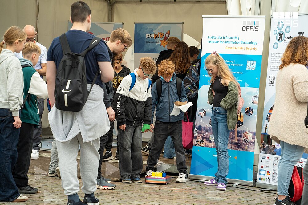 Als Teil des AHOI_MINT-Clusters NordWest war OFFIS mit einem eigenen Stand vertreten. Mitarbeitende aus verschiedenen Fachbereichen des Instituts präsentierten gemeinsam mit Prof. Susanne Boll, Vorständin des OFFIS, spannende Einblicke in die Welt der Digitalisierung und Informatik. Anhand praxisnaher Demonstrationen und Mitmach-Angebote konnten die jungen Besucher*innen die Vielfalt der MINT-Themen hautnah erleben und neue Perspektiven für die Zukunft gewinnen.