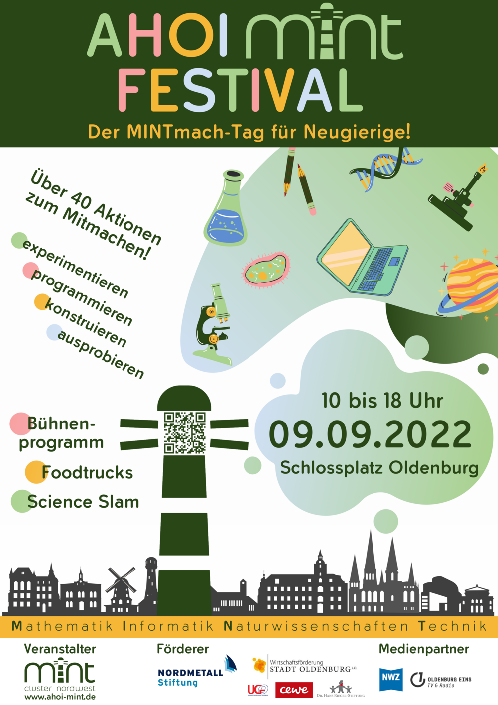 Über 40 Aktionen zum Mitmachen gibt es am Freitag, dem 09. September auf dem Oldenburger Schlossplatz. Kinder, Eltern, Schulklassen und Lehrkräfte – sowie alle anderen Besucher*innen der Stadt sind herzlich eingeladen, MINT-Aktivitäten (MINT=Mathematik, Informatik, Naturwissenschaften und Technik) und die Vielfalt der außerschulischen Lernorte in der Region Nordwest an diesem Tag zu entdecken und kennenzulernen! „Experimentieren, programmieren, tüfteln und ausprobieren" ist das Motto am „MINTmach-Tag für Neugierige!“. Neben zahlreichen Ständen gibt es Foodtrucks und ein spannendes Bühnenprogramm in den Schlosshöfen mit Science Slam, Experimenten und kurzen Vorträgen. Abgerundet wird der Tag ab 19 Uhr im Landesmuseum Natur und Mensch mit einem großen Science Slam. Das MINT Cluster NordWest und seine Mitglieder freuen sich auf Euren und Ihren Besuch!