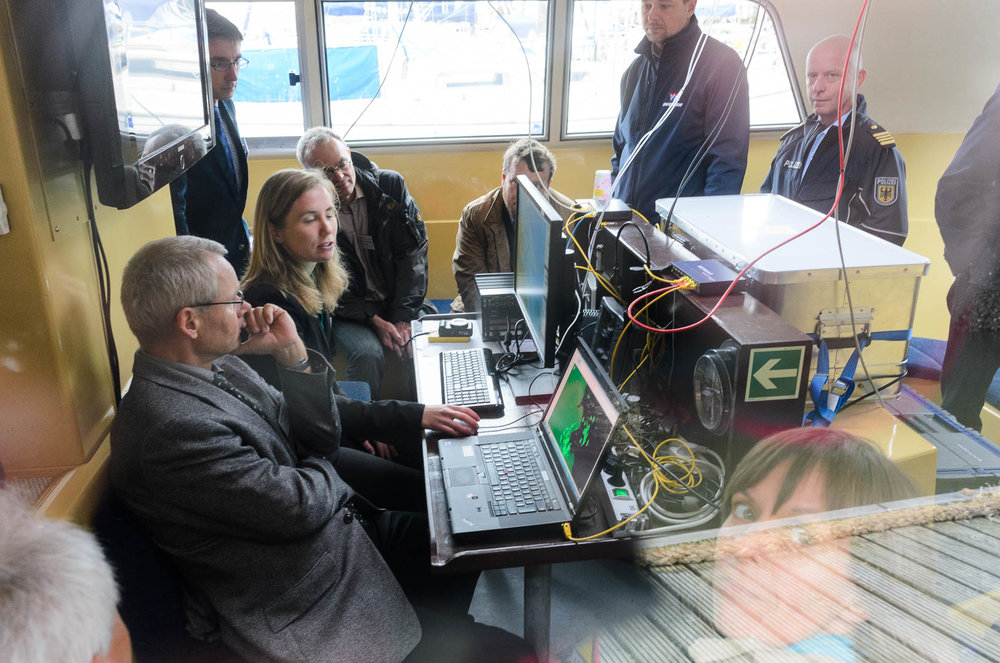 Abschlussdemonstration des BMWi-Projekts „COSINUS - Kooperative Schiffsführung für Nautische Sicherheit“ für die Erforschung der Integration land- und bordseitiger Navigationssysteme am 16. 09.2015. Ziel des Projektes: Die Abstimmung der Schiffsführer und die Beratung durch die Verkehrszentrale durch verbesserte, einheitliche Situationswahrnehmung der Verkehrslage zu optimieren.