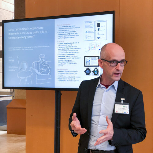 Das Poster stellt Technologie vor, die ältere Menschen zu mehr Bewegung im Haushalt motivieren soll. Der besondere Pfiff: anstatt eines umfangreichen und komplizierten Trainings sollen im Tagesverlauf viele kleine Übungen durchgeführt werden. Die besondere Herausforderung für die Technologie ist es daher, sich gut in den Alltag zu integrieren. In einer Studie werden nun 20 Haushalte mit und ohne diese Technologie über ein Vierteljahr begleitet und die Unterschiede beobachtet.