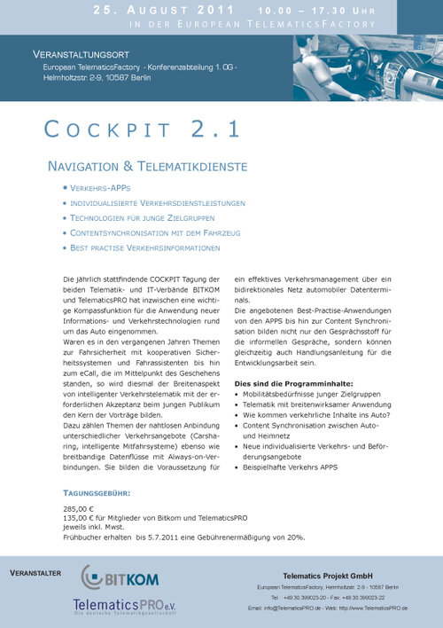 Auch in diesem Jahr übernehmen wieder die beiden IT- und Telematikverbände BITKOM und TelematicsPRO die Schirmherrschaft für die Tagung "Cockpit 2.1 Navigation & Telematikdienste", die am 25. August 2011 von 10:00 bis 17:30 Uhr in der European TelematicsFactory in Berlin stattfinden wird. Diesmal wird der Breitenaspekt von intelligenter Verkehrstelematik mit der erforderlichen Akzeptanz beim jungen Publikum den Kern der Vorträge bilden.
