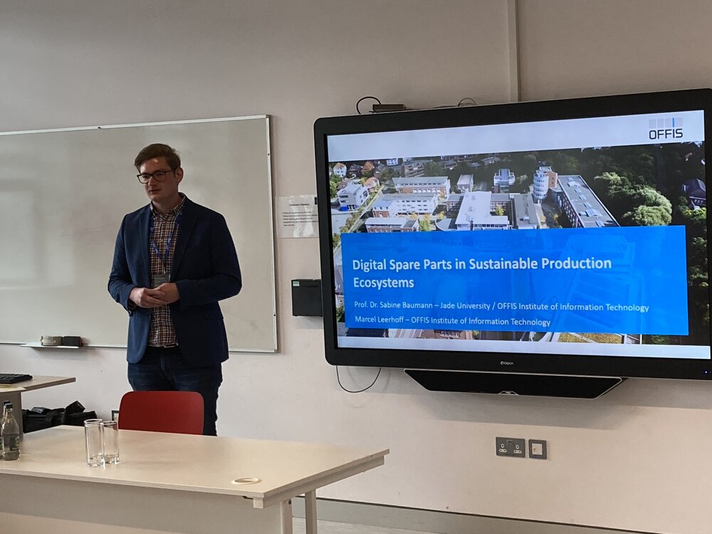 Mit ihrem Beitrag „Digital Spare Parts in Sustainable Production Ecosystems“ stellten Frau Prof. Dr. Sabine Baumann, wissenschaftliche Leiterin des OFFIS Bereichs Produktion, und Marcel Leerhoff, wissenschaftlicher Mitarbeiter im Bereich Produktion des Instituts, das Konzept der digitalen Ersatzteile im Kontext der additiven Fertigung und nachhaltiger Produktionsökosysteme vor.