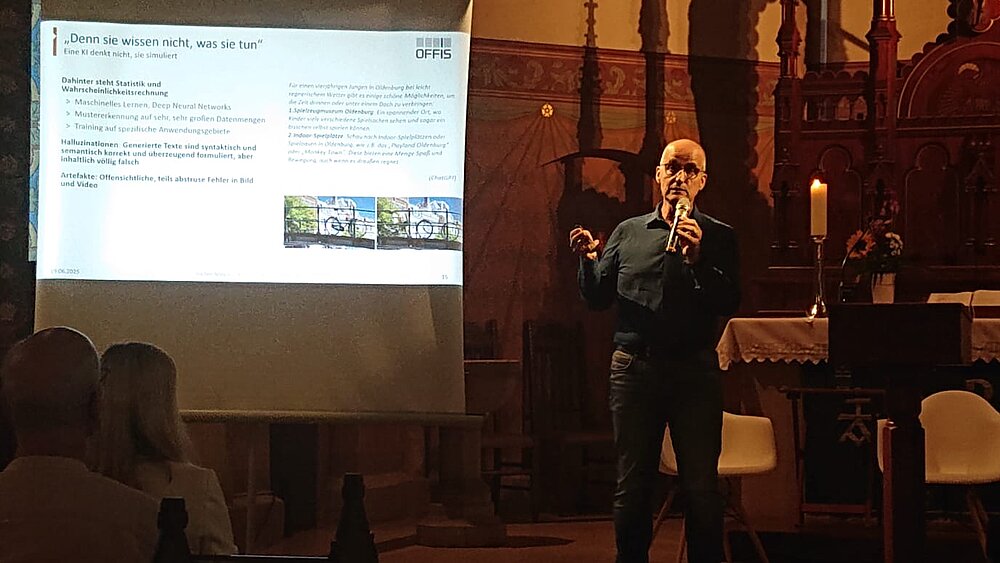 Pastorin Dr. Anna Cornelius beleuchtete die Thematik aus theologischer und seelsorgerlicher Perspektive, während Cordelia Wach von der Stiftung Hospizdienst Oldenburg von ihren Erfahrungen in der Trauerbegleitung berichtete. Dr. Jochen Meyer, Bereichsleiter Gesellschaft des OFFIS, präsentierte den technischen Blickwinkel. Er zeigte eindrücklich, wie Künstliche Intelligenz bereits heute digitale Persönlichkeitsabbilder aus Sprachdaten, Bildern, Videos oder Chatverläufen erstellt – interaktive „Erinnerungswesen“, die mit Hinterbliebenen kommunizieren können.