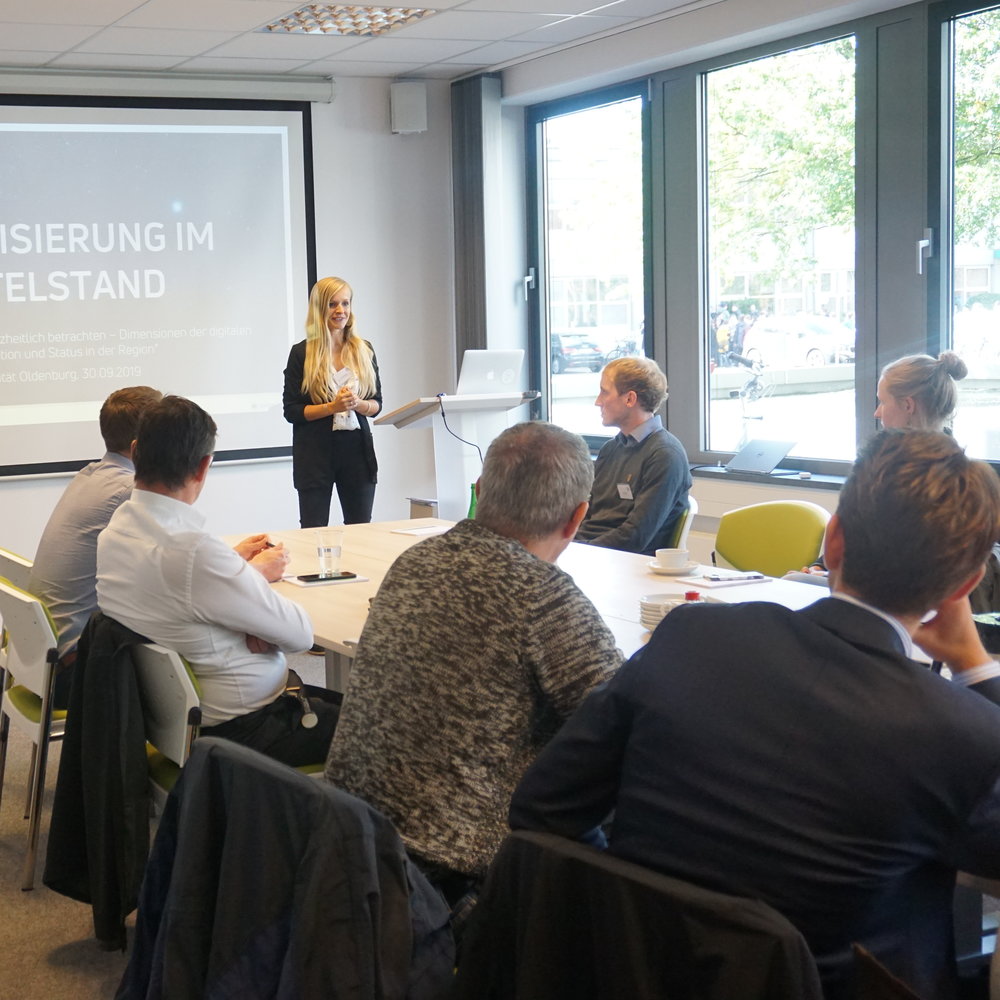 Uta Strumpel vom Lehrstuhl für Entrepreneurship der Universität Oldenburg gab Einblicke in die Ergebnisse der Studie „Digitale Innovation im Mittelstand – Fallbeispiele erfolgreicher Digitalisierungsprojekte“. In einem zweiten Kurzvortrag stellte Timo Kasselmann neun Dimensionen der digitalen Transformation von Unternehmen anhand des St. Galler House of Digital Business dar.