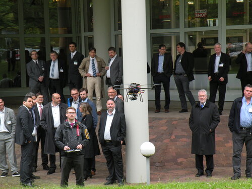Durch Glück mit dem Wetter und einer windstillen Regenpause konnte den Reviewern und den Partnern auf dem Außengelände des Siemens Campus eine kleine Demontration des Multi-Rotor Systems im Flug gegeben werden.