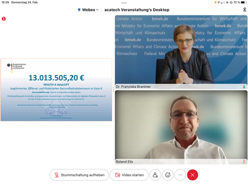 OFFIS wurde während der Online-Veranstaltung von Prof. Dr. Susanne Boll (Vorständin) und Dr. Jochen Meyer (Bereichsleiter Gesundheit) vertreten. Als Teil des Projekts „Health-X dataLoft“ arbeitet OFFIS daran, Bürgerinnen und Bürger in den Fokus der Bereitstellung, der Nutzung sowie der Kontrolle der eigenen Gesundheitsdaten zu rücken. Das Projektziel ist die Entwicklung von transparenten, cloudbasierten Anwendungen in hochrelevanten Gebieten der Gesundheitsversorgung gemäß GAIA-X-Standards.