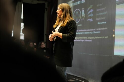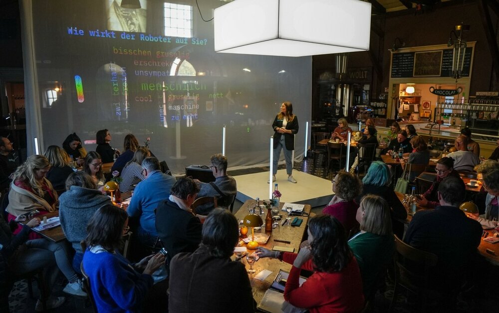 Nach einem ersten Willkommensgruß begann die Show - und das mit einer ganz besonderen Moderation: Eine Puppe und ein Hologramm der vermeintlich künstlichen Intelligenz „Galatea“, gespielt von Claudia Spörri und von Kathrin Steinweg, begleiteten das Programm und diskutierten, gespickt von literarischen Querverweisen, über das (Mensch-) Sein oder Nichtsein. Es folgte der erste Impulsvortrag: Unter dem Titel „Othercare – wenn nicht menschlich, was dann?“ repräsentierte Frederike Jung das OFFIS und die Wissenschaft. Mittels tatkräftiger Unterstützung des Publikums, das via Live-Abstimmungen am Impulsvortrag teilnahm, zeigte Frederike Jung die Probleme der aktuellen humanoiden Roboter-Designtrends auf und stellte ihren Forschungsansatz vor. Nach ihrem Vortrag folgten ein Galatea Kartenspiel und spannende Diskussionen an den Gruppentischen, die noch bis in die Pause fortgeführt wurden.