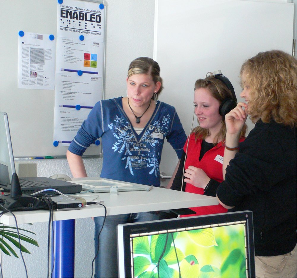 Dass die Informatik kein trockenes Thema ist, nicht ausschließlich mit Mathematik zu tun hat und dass der Beruf von einer Informatikerin Kreativität und Teamfähigkeit erfordern, erfuhren heute 12 Schülerinnen im Alter von 12 bis 15 Jahren beim „Girls Day 2006 – Zukunftstag“ im OFFIS. Neben Erläuterungen zu den vielfältigen Anwendungsbereichen der Informatik sowie den unterschiedlichsten Ausbildungs- und Studienmöglichkeiten wurde unseren Besuchern anhand zweier Exponate verdeutlicht, wie die tägliche Praxis in einem Informatik-Forschungsinstitut aussehen kann. So faszinierten Fragestellungen, warum ein Insektenroboter genau sechs Beine hat und nicht acht und wieso Geometrie dabei eine Rolle spielt. Auch die Erkenntnis, dass Blinde durch Hören in die Lage versetzt werden können an Computerspielen teil zu haben, wurde vermittelt. Spielerisch erprobten die Schülerinnen wie es ist, einen virtuellen Raum „nur“ akustisch erfahren zu können.