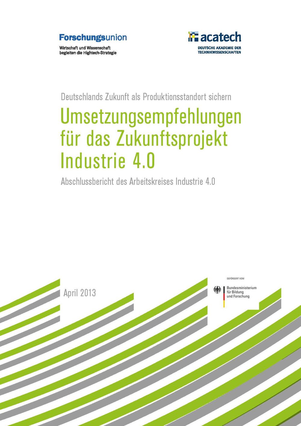 Industrie 4.0 ist ein Zukunftsprojekt der Bundesregierung und wurde im Januar 2011 von der Promotorengruppe Kommunikation der Forschungsunion Wirtschaft – Wissenschaft initiiert. Nach der Konstituierung des Arbeitskreises im Januar 2012 und ersten Umsetzungsempfehlungen im Oktober 2012 schließt der Arbeitskreis zur Hannover Messe seine Arbeit ab. Koordiniert von acatech – Deutsche Akademie der Technikwissenschaften hat der Arbeitskreis Voraussetzungen für einen sozialpartnerschaftlichen und systemischen Ansatz auf dem Weg in die Industrie 4.0 geschaffen. Im Arbeitskreis haben Unternehmen und Verbände verschiedener Branchen, Wissenschaftler unterschiedlicher Fachrichtungen und Gewerkschaften zusammengearbeitet.