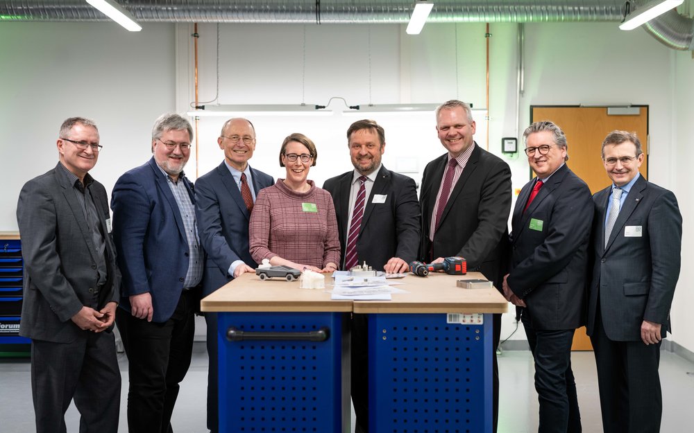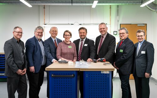 Erkunden die neue Metallwerkstatt der IHJO (v.l.n.r.): Prof. Dr. Jorge Marx Gómez (Informatikinstitut OFFIS), der Bundestagsabgeordnete Stephan Albani, Universitätspräsident Prof. Dr. Dr. Hans Michael Piper, IHJO-Gesamtprojektleiterin Dr. Michaela Muylkens (Universität), der Vizepräsident der Jade Hochschule, Prof. Dipl.-Ing. Thomas Wegener, Wissenschaftsminister Björn Thümler, IHJO-Projektleiter Hans-Peter Ratzke (Jade Hochschule) und Dr. Jürgen Meister (OFFIS, Bereichsleiter Energie). Foto: IHJO / Mohssen Assanimoghaddam