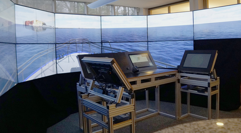 Verkehrs- und Brückensimulator der e-Maritime Integrated Reference Platform (eMIR) am OFFIS, welche unter anderem aus einem physischem Testfeld in der Deutschen Bucht und einer virtuellen Abbildung im Labor besteht.