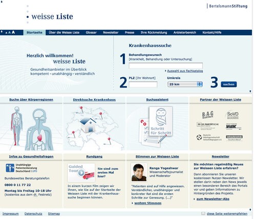 Für Patienten und Angehörige gibt es seit Juni 2008 ein interaktives Instrument, das sie bei der Suche nach dem für sie geeigneten Krankenhaus unterstützt: das Internetportal www.weisse-liste.de. Das unabhängige Portal ist ein gemeinsames Projekt der Bertelsmanns Stiftung und der Dachverbände der größten Patienten- und Verbraucherorganisationen und wurde vom Oldenburger OFFIS – Institut für Informatik mitentwickelt. Seit dem Start konnte die Weisse Liste schon 4,5 Millionen Besuche verzeichnen. Interessierte finden dort leicht verständliche Informationen zum Leistungsangebot und zur Qualität der rund 2.000 deutschen Kliniken. Die von den Krankenhäusern im Jahr 2006 erbrachten Leistungen bildeten die bisherige Datengrundlage. Im Herbst 2009 wurde – wie vom Gesetzgeber gefordert - durch die Krankenhäuser ein aktueller Datenbestand in Qualitätsberichten für das Jahr 2008 veröffentlicht. Dieser bringt neben der Aktualisierung der Leistungsdaten auch einige Veränderungen im Hinblick auf die Struktur und den Umfang der dokumentierten Informationen mit sich. OFFIS wurde von der Bertelsmann Stiftung mit der Erfassung und Integration der aktuellen Datenbestände beauftragt, um diese im Portal anzuzeigen.