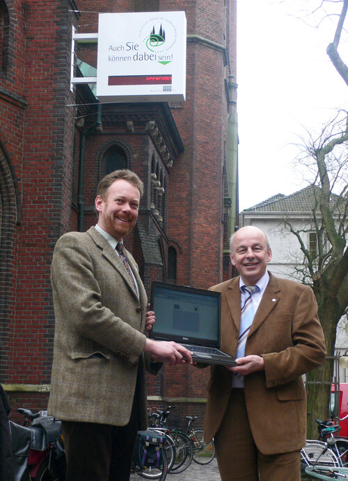 Heute weihten Pastor Dr. Ralph Hennings und OFFIS-Vorstand Prof. Dr. Hans-Jürgen Appelrath die neue Spendenuhr an der St. Lamberti-Kirche in Oldenburg ein.