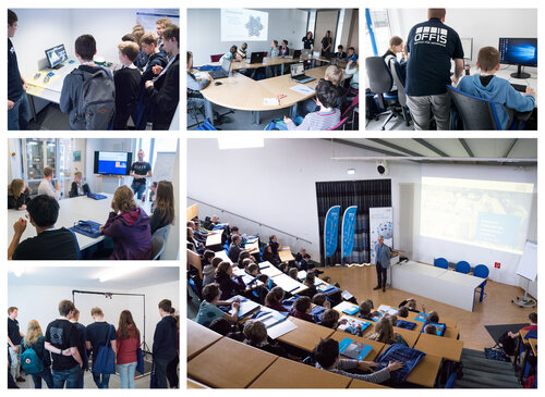Nach der Begrüßung und einer Kurzvorstellung von OFFIS konnten die Schülerinnen und Schüler in kleinen Gruppen Exponate aus den Bereichen Energie, Gesundheit und Verkehr erkunden. Hierbei bekamen Sie einen praktischen Einblick, wo in der Informatik Mathematik eingesetzt wird bzw. Anwendung findet.
