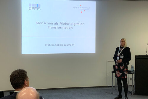 In der zweiten Diskussionsrunde der Veranstaltung ging es um "Menschen als Motor digitaler Transformation" mit den Fragestellungen: Wie können Mitarbeiter für den digitalen Wandel motiviert und mitgenommen werden? Wie werden Menschen von Bremsern zu Mitwirkern?. Einer der beiden Impulsvorträge wurden von Prof. Dr. Sabine Baumann, Professorin für Betriebswirtschaft an der Jade Hochschule und wissenschaftliche Leiterin in unserem neuen FuE-Bereich Produktion, gehalten. Sie betonte in ihrem Vortrag, dass ein gelungenes Change Management im Rahmen von digitalen Transformationen eine immer größere Rolle spielen wird. Ihre Checkliste für den Umgang mit Veränderungen umfasste vier wesentliche Punkte: