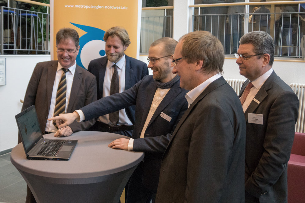 Viel Freude an den neuen Auswertungsmethoden des Regionalmonitorings: (v.l.n.r.) Klaus Wegling, Leiter der Wirtschaftsförderung der Stadt Oldenburg; Prof. Dr.-Ing. Andreas Hein, Vorstandsmitglied im OFFIS; Sebastian Specht, OFFIS; Bernd Kramer, Geschäftsführer der regio gmbh; Landrat Jörg Bensberg, 1. Vorsitzender der Metropolregion Nordwest