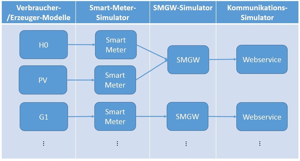 Zur Umsetzung dieser Simulation wird in NetzDatenStrom das Co-Simulations-Framework „mosaik“ verwendet, mit dessen Hilfe großskalige Szenarien zusammenzusetzt werden können. Dabei koppelt mosaik dedizierte Simulatoren für jedes SMGW, jedes Smart Meter sowie für die Kommunikation der Zählerdaten und koordiniert den Austausch zwischen den Simulatoren. Darüber hinaus existieren eigene Simulatoren um das Verhalten der eigentlichen Verbraucher und Erzeuger im Niederspannungsnetz wiederzugeben. Für jede Art von Verbraucher ist dabei ein Standardlastprofil hinterlegt. Für PV-Erzeugungsanlagen werden neben den Stammdaten der Anlagen auch Wetterdaten genutzt werden um Erzeugungsprofile zu generieren.