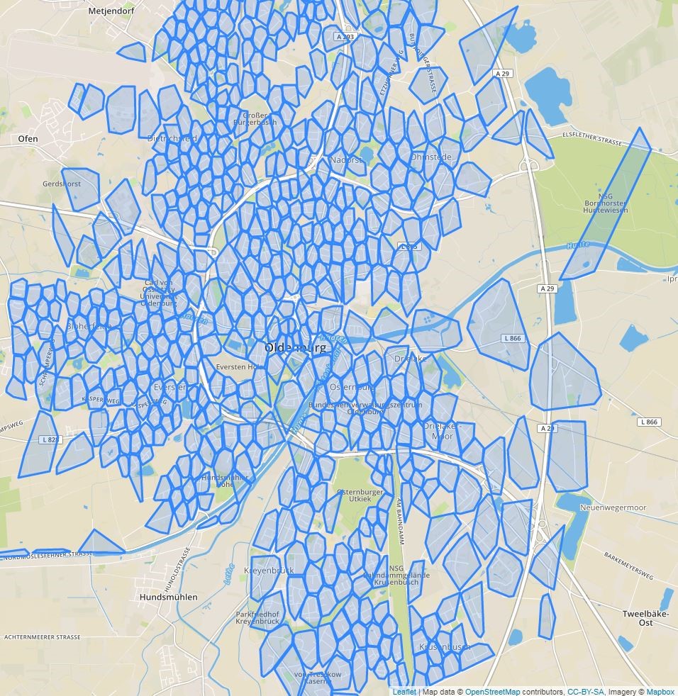Ein Szenario für die Simulation lässt sich sowohl manuell erstellen als auch parametrisiert generieren. Dadurch ist es möglich auch besonders große Szenarien zu erstellen, beispielsweise die Simulation für einen ganzen Landkreis. Die Netztopologie wird dabei anhand von beispielhaften aber realistischen Angaben eines Netzbetreibers nachgebildet und beinhaltet Angaben für Geo-Koordinaten der Messstellen, Angaben zur Anzahl und Verteilung verschiedener Verbraucher, der Aufteilung zwischen Haushalten, Industrie und PV-Erzeugungsanlagen sowie zur Größe der einzelnen Niederspannungsnetze. In Abbildung 2 ist ein Beispiel-Szenario für die Stadt Oldenburg, das anhand der oben genannten Parameter generiert wurde, zu sehen. Jede der Flächen bildet ein Niederspannungsnetz mit durchschnittlich 100 Anschlüssen.