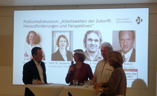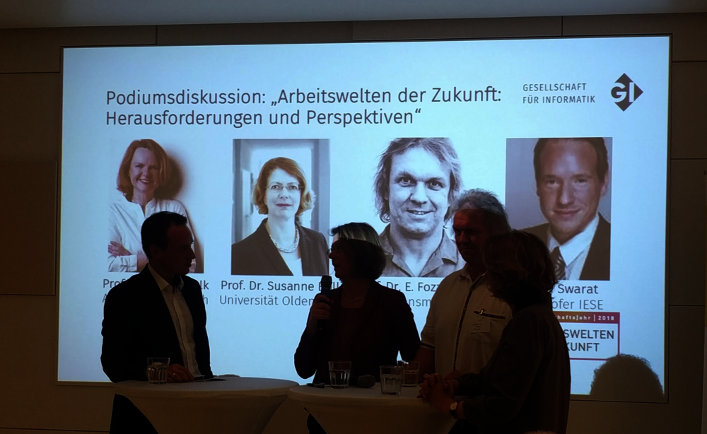 In der Podiumsdiskussion: „Arbeitswelten der Zukunft: Herausforderungen und Perspektiven“ diskutierten OFFIS-Vorstand Prof. Dr. Susanne Boll, Prof. Dr. Svenja Falk von Accenture Research und Prof. Dr. E. Fozzy Moritz von der Innovationsmanufaktur, wie Virtual und Augmented Reality, Ubiquitous Computing oder Robotik so ausgestaltet werden können, dass sie menschliche Akteure bei der Durchführung komplexer Tätigkeiten helfen anstatt sie zu ersetzen.