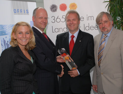Prof. Dr.-Ing. Wolfgang Nebel, OFFIS Vorstandsvorsitzender, nahm die Auszeichnung entgegen und freute sich: „Wir sind stolz darauf, ein ausgewählter Ort im Land der Ideen zu sein. Seit Gründung von OFFIS forschen wir mit visionärem Blick nach vorne und transferieren neue wissenschaftliche Erkenntnisse in innovative Anwendungen in der Wirtschaft. Unsere heutigen sechs Forschungsbereiche stehen für ausgewählte Anwendungs- und Technologiekompetenzen im Umfeld der Informatik.“