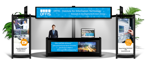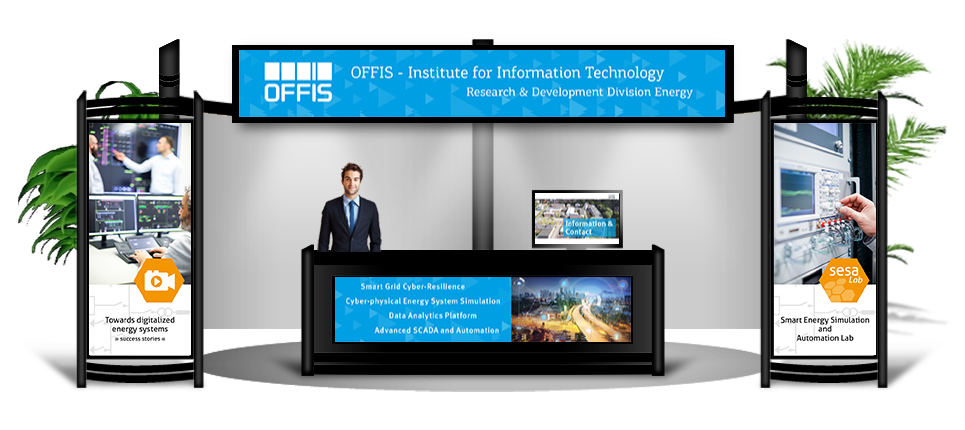 Um diese Idee zu unterstützen, ergriff OFFIS die Gelegenheit, Sponsor der Veranstaltung zu werden. Infolgedessen wurde das Institut mit einem virtuellen Messestand ausgestattet, der primär das SESA-LAB (Smart Energy Simulation and Automation Lab) und die Forschung im Bereich der Echtzeitsimulation der letzten Jahre repräsentieren sollte. Im SESA-LAB können Auswirkungen auf Energieversorgungssysteme großskalig in Echtzeit unter realitätsnahen Bedingungen co-simuliert werden, damit neue Komponenten in das System integriert werden können, um kritische Situationen zu identifizieren und eventuell notwendige Anpassungen zu entwickeln. Um die Wirkung des Messestandes zu maximieren, wurde unter der Leitung von Dr. Davood Babazadeh, Leiter der Gruppe "Automation, Communication and Control" innerhalb des Berechs Energie des OFFIS, exklusives Informationsmaterial erstellt, das einen detaillierten Einblick in die Arbeit des SESA-LABS bietet.