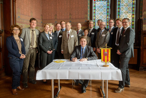 Fachkräftesicherung soll zukünftig als eine gemeinsame strategische Zukunftsaufgabe für Oldenburg angegangen werden – dies vereinbarten die an der Fachkräfte-Initiative beteiligten Unternehmen und Institutionen und unterzeichneten hierfür offiziell eine Rahmenvereinbarung. Alle Mitglieder des Bündnisses haben sich zum Ziel gesetzt, die Initiative dauerhaft durch Mitwirkung an geeigneten Maßnahmen zu unterstützen und in diesem Rahmen eigenverantwortlich Projekte und Aktivitäten innerhalb des eigenen Wirkungsbereiches zu befördern und zu begleiten. Auch OFFIS beteiligt sich an der Initiative und wurde von Vorstand Prof. Dr.-Ing. Andreas Hein bei der Unterzeichung vertreten.