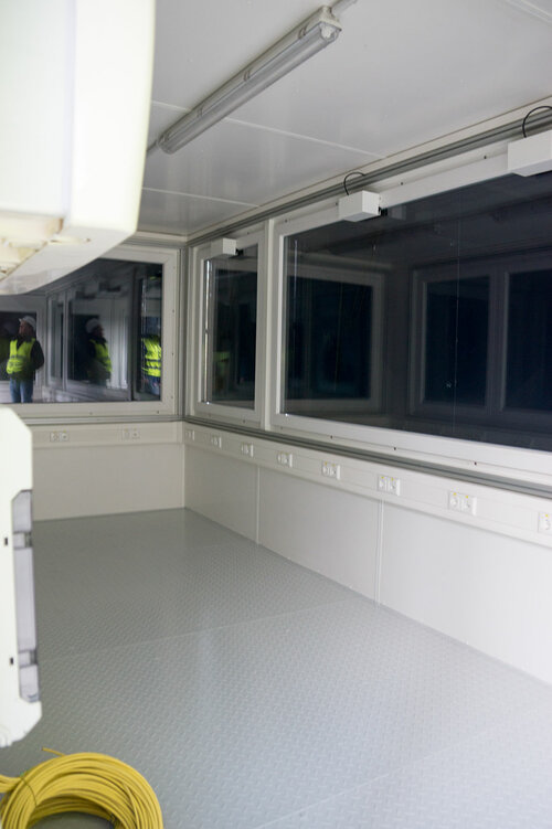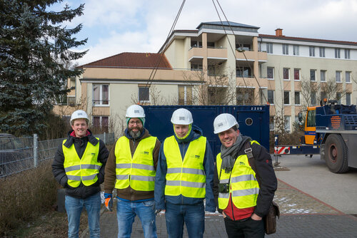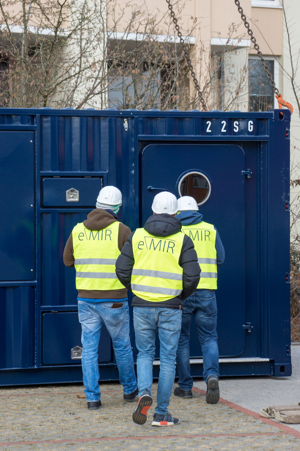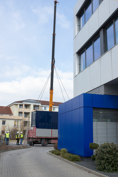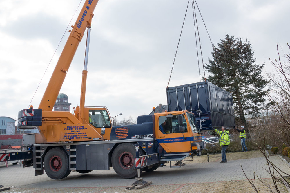 Schweres Gerät auf unserem Parkplatz! Die zwei Seecontainer für unsere mobile Schiffsbrücke - ein Testszenario im Themenfeld Autonome Schifffahrt - wurden geliefert und auf dem Parkplatz hinter unserem Gebäude an der Industriestraße 6 abgeladen. Der eine misst 20 Fuß und der andere 10 Fuß und beide bringen einiges an Gewicht auf die Waage, so dass ein Kran zum Abladen nötig war, was einige Zeit in Anspruch nahm.