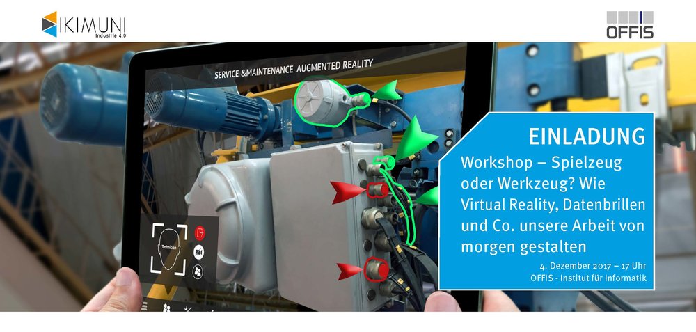 Ihr Unternehmen oder ihre Einrichtung möchte sich über die Zukunft von Datenbrillen und Co. informieren? Besuchen Sie am 04. Dezember 2017 bei OFFIS den Workshop unseres Nds. IKT-Zentrums für für Industrie 4.0 (IKIMUNI). Wir stellen verschiedene Modelle vor und möchten mit Ihnen mögliche Anwendungsgebiete diskutieren. Der Workshop ermöglicht auch das Ausprobieren der verschiedenen Systeme.