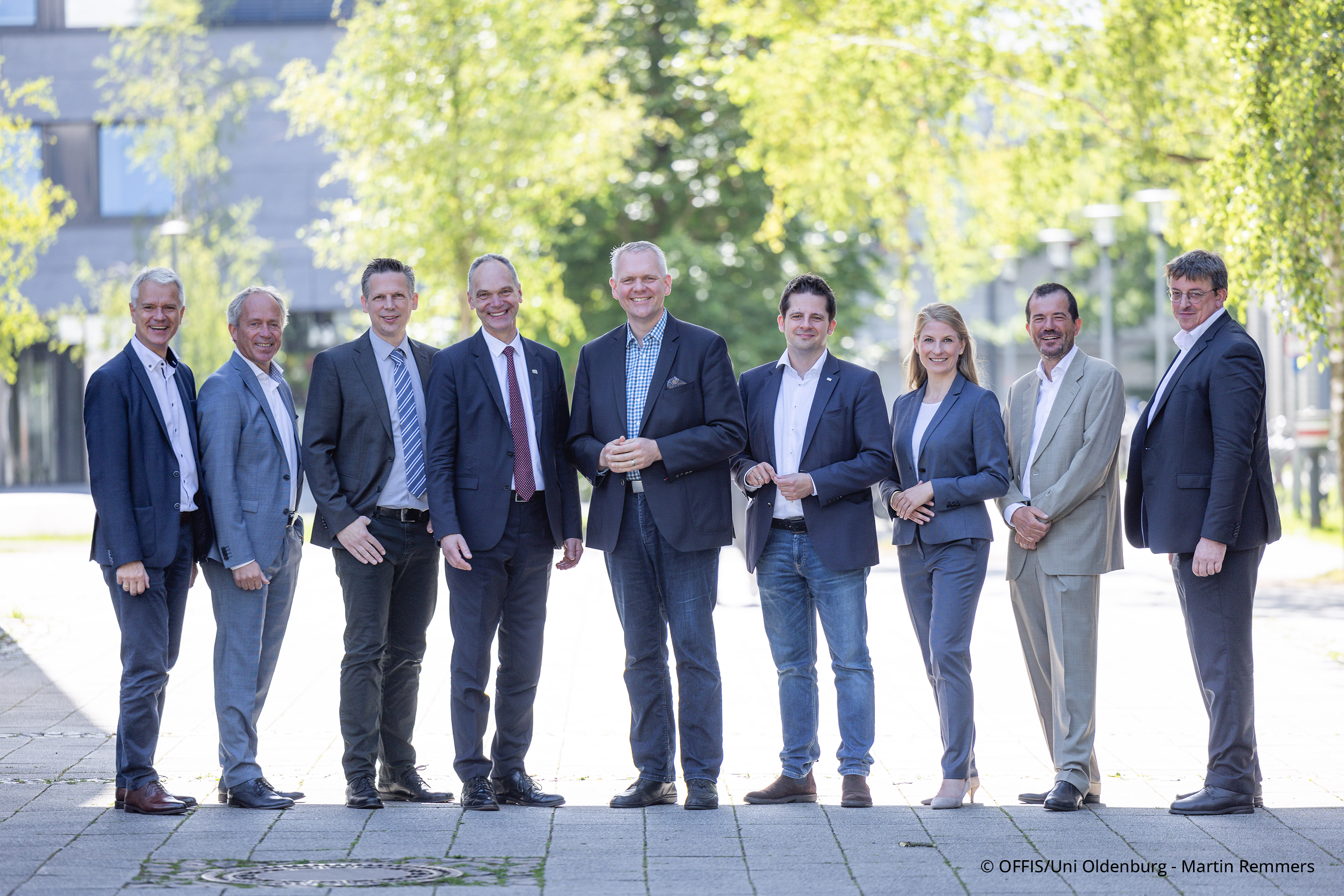V.l.n.r.: Dr. Holger Peinemann (Geschäftsführer OFFIS), Ralph Wilken (Leiter der Wirtschaftsförderung Stadt Oldenburg), Prof. Oliver Zielinski (Leiter des Forschungsbereichs Marine Perception, DFKI Niedersachsen), Prof. Ralph Bruder (Präsident der Universität Oldenburg), Björn Thümler (Niedersächsischer Minister für Wissenschaft und Kultur), Prof. Sebastian Lehnhoff (OFFIS Vorstandsvorsitzender), Dr. Laura Meliß (DLR), Prof. Axel Hahn (Institutsleiter DLR Institut Systems Engineering für zukünftige Mobilität), Jürgen Niehaus, Geschäftsführer Innovationsquartier Oldenburg GmbH.