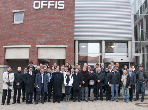 Im Rahmen Ihrer Teilnahme an der CeBIT stattete eine Delegation von 45 südamerikanischen Unternehmerinnen und Unternehmern der IT-Branche am 28.02.2011 OFFIS einen Besuch ab und konnten sich hier ein Bild der Forschungsarbeiten und der Netzwerklandschaft in Deutschland machen. Vorgestellt wurden u.a. das bei OFFIS ansässige Kompetenznetzwerk SafeTRANS e.V. und die verschiedenen OFFIS-Projekte im AAL-Kontext, die im IDEAAL-Seniorenapartment Anwendungsbeispiele geben.