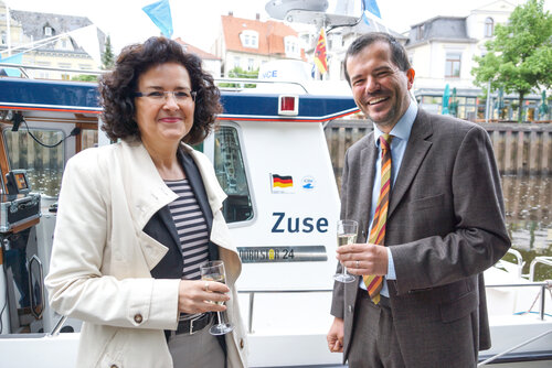 Im Beisein von Landtagsabgeordneten, dem Präsidenten der Universität Oldenburg Prof. Dr. Dr. Hans Michael Piper, dem OFFIS Vorstandsvorstandsvorsitzenden Prof. Dr.-Ing. Wolfgang Nebel, dem Dekan des Fachbereichs Seefahrt der Jade Hochschule Prof. Dr. Ralf Wandelt, dem stellvertretenden Leiter des ICBM, Prof. Dr. Heinz Wilkes und Vertreterinnen des Kompetenzzentrum GreenShipping, hat die Niedersächsische Wissenschaftsministerin Gabriele Heinen-Kljajic heute das neue Forschungsboot des OFFIS auf den Namen „Zuse“ getauft. Die Ministerin betonte in Ihrer Taufrede: „ OFFIS trägt mit dem Ausbau der maritimen Verkehrsforschung dazu bei, die Seefahrt sicherer, effektiver und umweltfreundlicher zu gestalten. Damit leistet OFFIS internationale Spitzenforschung im Bereich der sicherheitskritischen, eingebetteten Systeme.“ Sie übergab das Boot dem Einsatz unter der Leitung von Prof. Dr.-Ing. Axel Hahn mit den Worten „Mit diesem Forschungsboot steht Informatikern wie Meeresforschern nun eine neue kleine, aber dafür sehr schnelle Forschungsplattform zur Verfügung, die die vorhandene Flotte der Universität bestens ergänzt.“ Prof. Hahn koordiniert die Maritime Forschung am OFFIS.