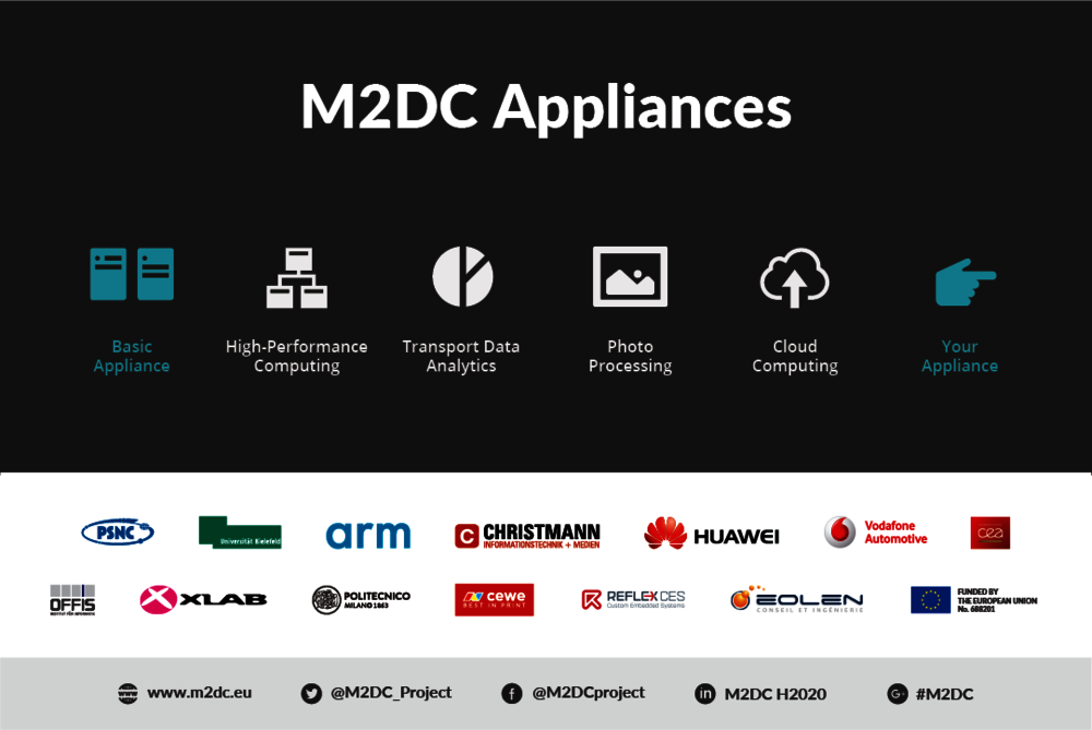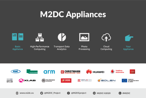 Baseline benchmarks show the high potential of accelerators for the targeted applications including photo finishing systems, IoT data processing, cloud computing, CNN and HPC. The system design includes an optimized middleware for deployment of optimized appliances. These target specific needs in selected markets including High Performance Computing, Big Data Analytics, Signal Processing and Cloud Computing. The M2DC customer can also acquire a basic appliance that can be tuned to address a specific problem, or a custom appliance for its business or research needs counting on full support of our M2DC team of experts.