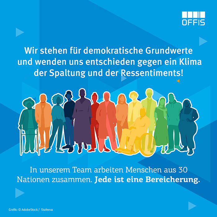 Die aktuellen populistischen Tendenzen, die teilweise mit Verrohung und Ausgrenzung einhergehen, stellen eine Gefahr für unsere offene Gesellschaft dar und dürfen nicht unwidersprochen bleiben. Es liegt in der Verantwortung jeder/jedes Einzelnen, aktiv für den Erhalt demokratischer Grundwerte einzutreten und sich für eine faire und sachliche politische Auseinandersetzung zu engagieren. Wir bei OFFIS setzen gerne ein starkes Zeichen für unsere demokratischen Grundwerte und wenden uns entschieden gegen ein Klima der Spaltung und der Ressentiments.