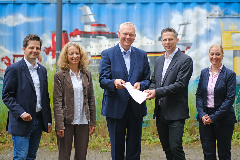 Übergabe des Förderbescheids für das Zukunftslabor Wasser (v. l. n. r.): Prof. Dr. Sebastian Lehnhoff (Carl von Ossietzky Universität Oldenburg | OFFIS - Institut für Informatik), Prof. Dr. Christiane Thiel (Carl von Ossietzky Universität Oldenburg), Minister Björn Thümler (Niedersächsisches Ministerium für Wissenschaft und Kultur), Prof. Dr. Oliver Zielinski (Carl von Ossietzky Universität Oldenburg | Deutsches Forschungszentrum für Künstliche Intelligenz), Dr.-Ing. Agnetha Flore (Zentrum für digitale Innovationen Niedersachsen). © Markus Hibbeler | Universität Oldenburg