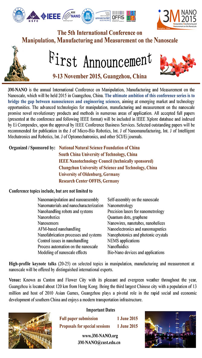 3M-NANO is the annual International Conference on Manipulation, Manufacturing and Measurement on the Nanoscale, and will be held from 9th to 13th November 2015 in Guangzhou, China. The ultimate ambition of this conference series is to bridge the gap between nanosciences and engineering sciences, aiming at emerging market and technology opportunities. The advanced technologies for manipulation, manufacturing and measurement on the nanoscale promise novel revolutionary products and methods in numerous areas of application