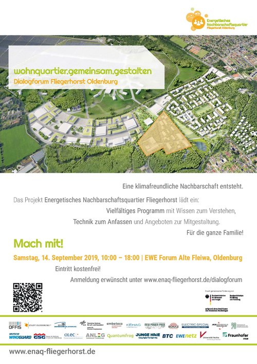 Die Entwicklungen auf dem Fliegerhorst-Gelände stoßen bei der Oldenburger Bevölkerung auf großes Interesse, auch in Bezug auf das Projekt Energetisches Nachbarschaftsquartier Fliegerhorst Oldenburg. Ziel des Projektes ist es, gemeinsam eine Teilfläche des Fliegerhorstes (etwa 4 ha) zu einem klimafreundlichen Nachbarschaftsquartier auszugestalten. Genau dieses Interesse und das Engagement vieler Bürgerinnen und Bürger, die eigene Stadt mitzugestalten, begrüßt das Projekt-Team sehr. Die Projektpartnerinnen und Projektpartner des Energetischen Nachbarschaftsquartiers Fliegerhorst Oldenburg möchten daher alle interessierten Oldenburger Bürgerinnen und Bürger zu einem Dialogforum einladen, um über die Entwicklungen im Projekt zu informieren, um über quartiersrelevante Themen zu diskutieren und um Meinungen aus der Bevölkerung zur Quartiersentwicklung einzuholen.