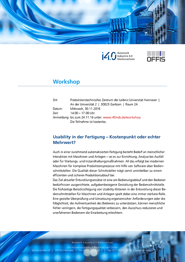 Anmeldung: bis zum 24.11.16 unter: www.i40nds.de/workshop