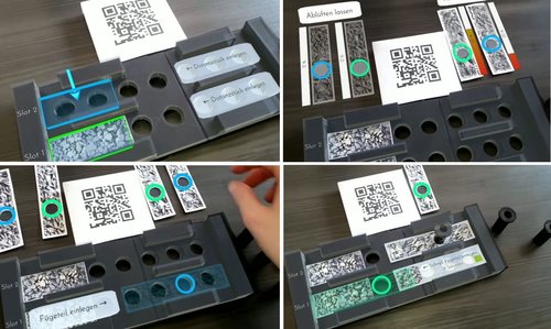 Für die Studie wurden aus einem Gesamtprozess vier besonders fehleranfällige Arbeitsschritte ausgewählt. Ein Ausschnitt der Sicht in Augmented Reality ist in Abb. 2 dargestellt.