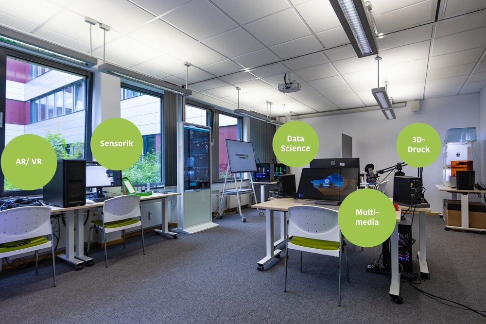 Kern der OFFIS Arbeiten war der Aufbau und Betrieb des Innovation(s)Labors digital, einem Labor für digitales Prototyping. Ausgestattet mit modernster Hardware, bietet es ein kreatives Umfeld, um digitale Prototypen umzusetzen und Anwendungsfälle zu erproben. Egal ob Data Science, Virtual Reality oder 3D-Druck – im Digitallabor können neue Technologien ausprobiert und genutzt werden. Hier können sich Vertreter*innen regionaler Unternehmen und Institutionen mit Forscher*innen und Studierenden über die Chancen und Herausforderungen der digitalen Transformation austauschen und gemeinsam an Lösungen arbeiten.